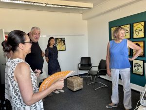 Ich durfte mir einige Ateliers von Künstler:innen verschiedener Richtungen anschauen: Malerei, Grafik, Bildhauerei, Textile Kunst, Poesie. Die kreative Vielfalt beeindruckte mich. Auch den gemütlichen Gemeinschaftsraum und moderne Sanitärräumlichkeiten inklusive Waschmaschine! zeigten mir die Gastgeber:innen. Mit dabei war der Hausbesitzer Alfred Holtkott und seine beiden Kinder, die im elterlichen Immobilienbetrieb arbeiten. Rose und Holtkott kennen sich schon lange und haben das Atelierhaus zusammen entwickelt – für beide ein Experiment mit viel Herz. Dazu gratuliere ich!!