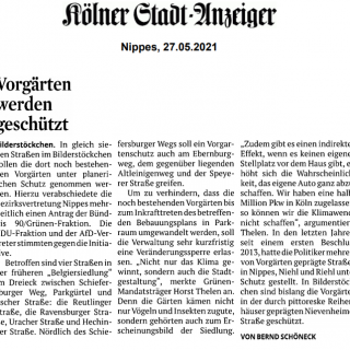Die Bezirksvertretung Nippes beschloss auf Antrag der Grünen in der Bezirksvertretungssitzung, Vorgärten in bestimmten Straßen in Bilderstöckchen zwischen Schiefersburger Weg, Parkgürtel und...