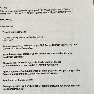 Am Donnerstag, 22. Mai 2025 ab 17:30 Uhr, lade ich Gäste zur öffentlichen Bezirksvertretungssitzung Nippes ein. Wir ehrenamtlichen Bezirksvertreter*innen tagen im Bezirksrathaus, Nebeneingang VHS,...