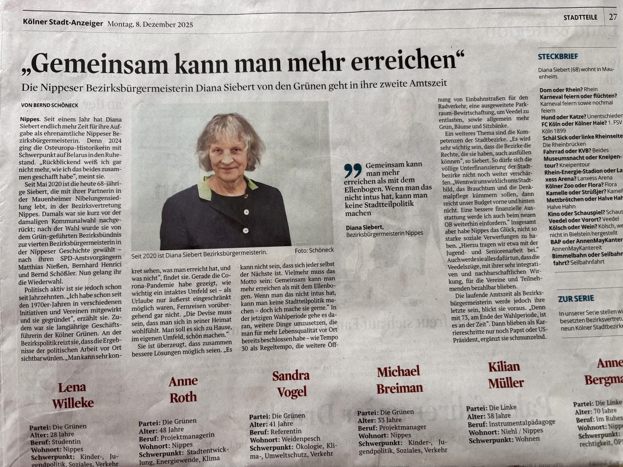 Danke, Bernd Schöneck, für die Veröffentlichung mit meinem Statement als neu gewählte Bezirksbürgermeisterin Nippes: „Gemeinsam kann man mehr erreichen als mit dem Ellenbogen. Wenn man das nicht intus hat, kann man keine Stadtteilpolitik machen“. Veröffentlicht im Kölner Stadt-Anzeiger, 8. Dezember 2025, auf Seite 27.